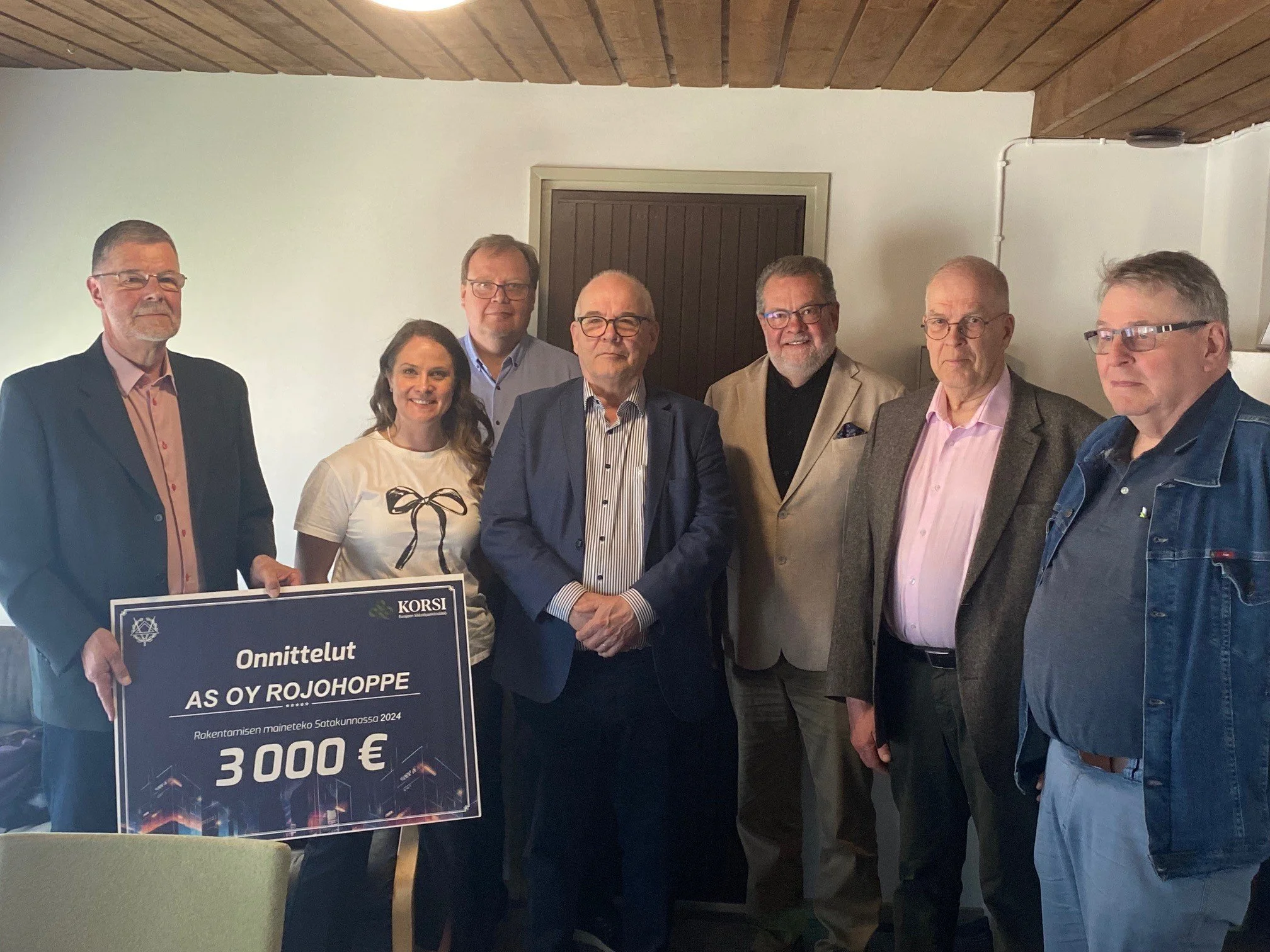 Kuvassa vasemmalta: Esko Sillanpää hallituksen pj, As Oy Rojohoppe, Eeva Hauta-Heikkilä, palkintoraadin edustaja SAMK, Peter Hillman, palkintoraadin edustaja, Satakunnan RIA, Kari Lindroos, palkintoraadin edustaja, Porin Rakennusmestarit ja -insinöörit ry, Matti Saustamo, palkintoraadin edustaja ja stipendin lahjoittaja, Korsi Säätiö, Esko Ahola, As Oy Rojohoppe, Reijo Hernesniemi, As Oy Rojohoppe, remontin projektinvetäjä.
